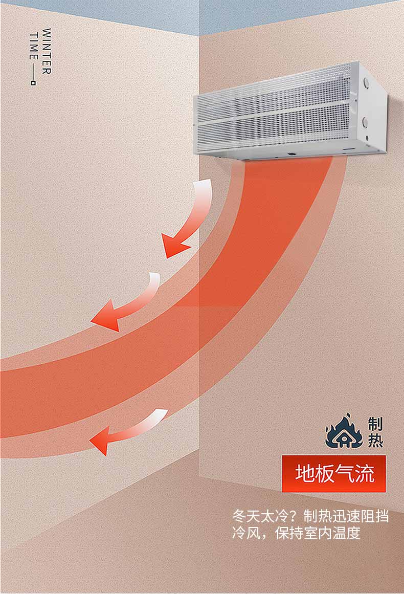 離心式熱空氣幕空氣幕安裝在地面之下。由于下送式空氣幕的射流最強(qiáng)區(qū)在門洞下部,因此抵擋冬季冷風(fēng)從門洞下部侵入時(shí)的擋風(fēng)效率最好,而且不受大門開(kāi)啟方向的影響。 但是下送式空氣幕的送風(fēng)口在地面下,容易被贓物堵塞, 而且下送風(fēng)的氣流容易將衣裙揚(yáng)起不受
