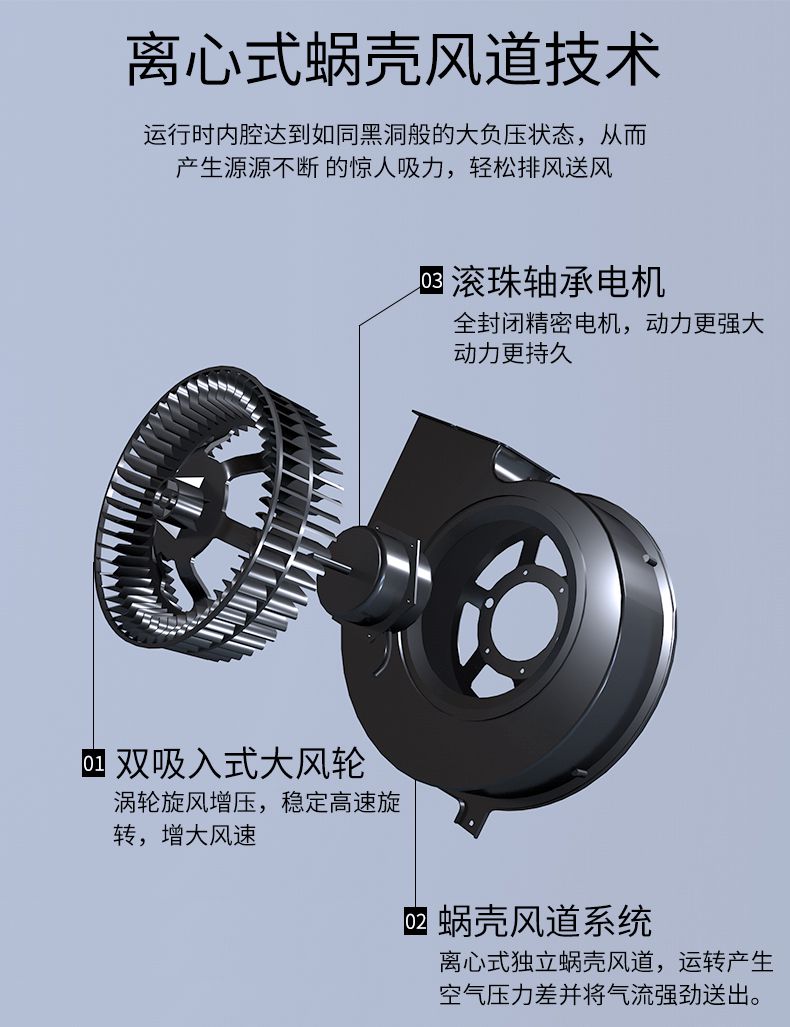 2、采用離心熱鍍鋅鋼板蝸輪風(fēng)道,安全可靠,經(jīng)久耐用,高速純銅電機,持續(xù)運行8000小時無故障,科學(xué)設(shè)計風(fēng)輪間隙,進(jìn)風(fēng)更順暢。